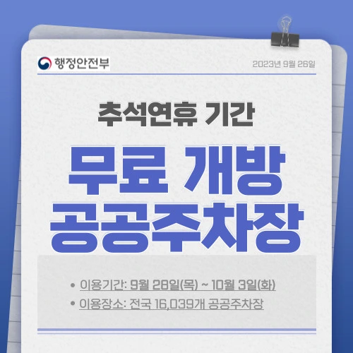 이번 포스팅에서는 추석연휴(9월 28일 ~ 10월 3일) 기간 무료로 개방하는 전국 주차장 정보에 대해서 알아보겠습니다.